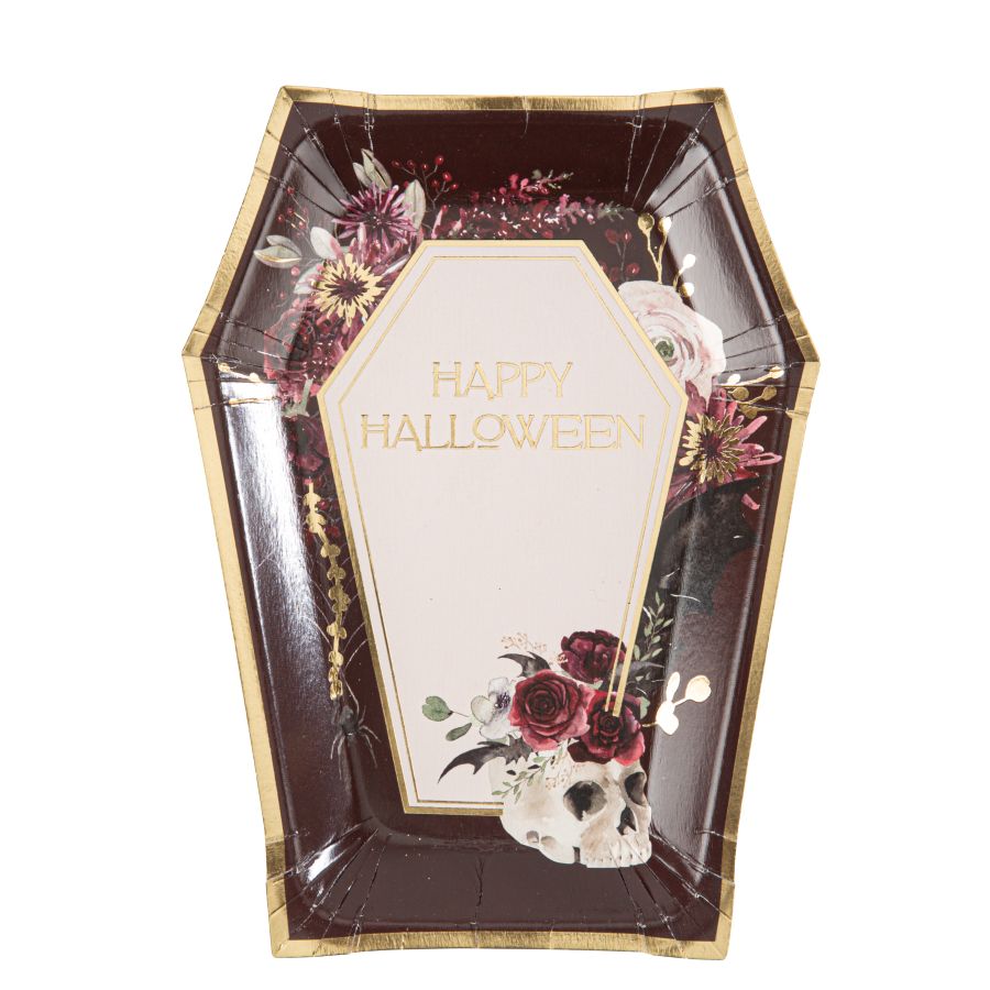8 Platos Ataúd "Happy Halloween" de Witchyland. Hechos de cartón resistente, combinan a la perfección espíritu festivo y practicidad para una merienda inolvidable. Ideales para completar la decoración de tu mesa, estos platos son la opción perfecta para encantar a los pequeños monstruos y facilitar la limpieza.