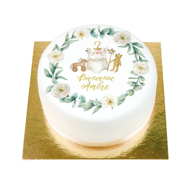 ¡Con sus delicadas acuarelas vintage, esta tarta es la elección perfecta para celebrar el nacimiento o futuro nacimiento de una niña! Cumpleaños o Baby Shower, haz de este evento un momento memorable con este pastel personalizable con su nombre, su edad o el texto de tu elección.