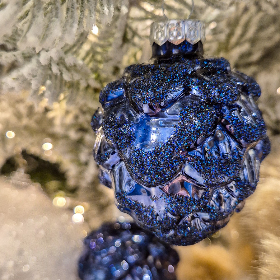 6 piñas azul medianoche de 7 cm – Vidrio brillante / mate – Purpurina