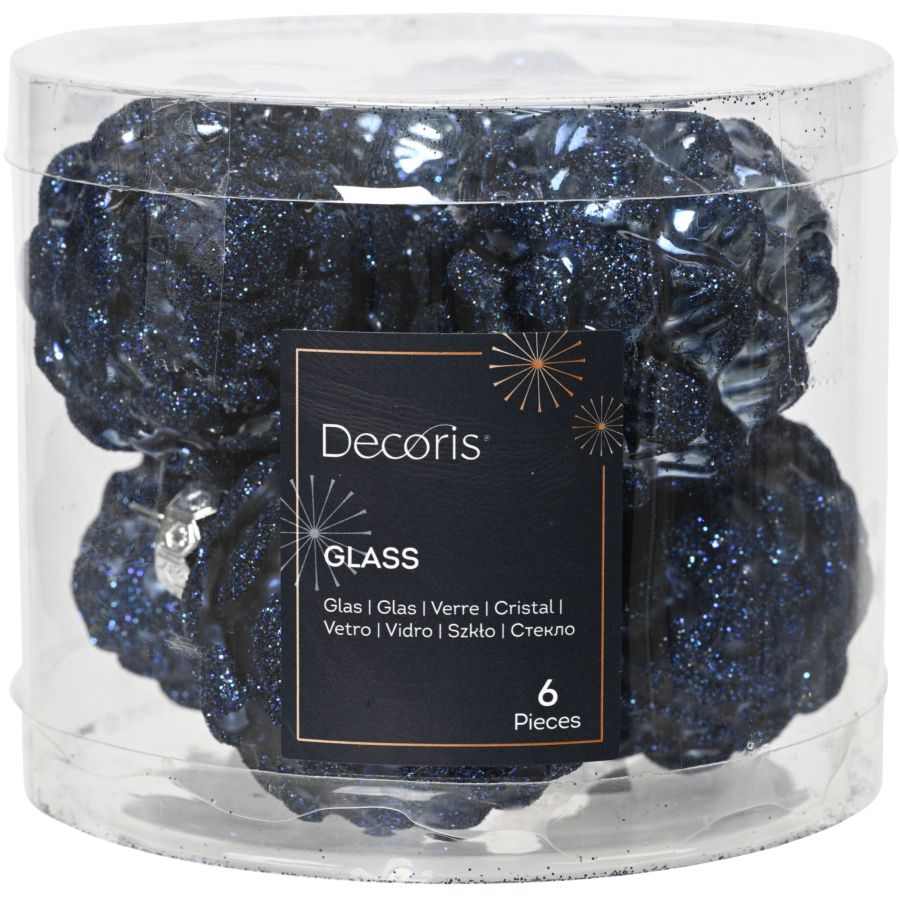 6 piñas azul medianoche de 7 cm – vidrio brillante/mate – purpurina