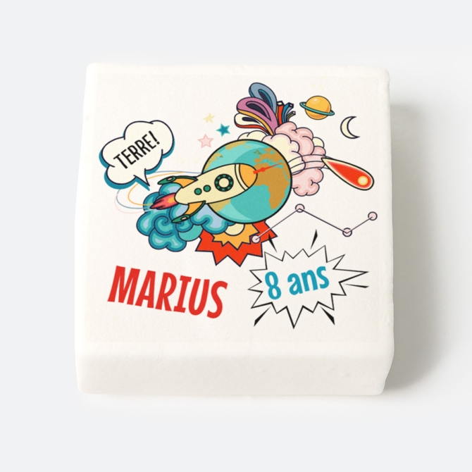 Gracias a nuestra herramienta de personalización, podrás añadir el nombre de tu hijo, una foto y modificar los elementos visuales a tu gusto. Tu personalización se imprimirá en una de las caras (con tinta comestible) y en 12 deliciosos malvaviscos.