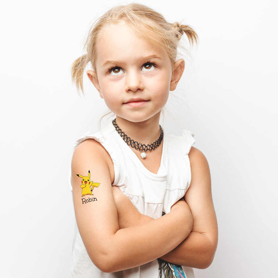 Una lámina de 8 tatuajes efímeros de Pokémon para personalizar con tu nombre, tu edad o la fecha de la fiesta, y para ofrecer a cada invitado como recuerdo o para hacer un taller de tatuaje durante un gran cumpleaños!